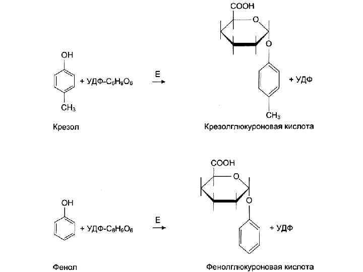 КОНЪЮГАЦИЯ 1. Присоединение глюкуроновой кислоты R-OH + УДФ-С 6 Н 9 О 6 УДФ-глюкуронилтрансфераза О > R-O-C 6 H 9 O 6 + УДФ 2. Присоединение остатка серной кислоты R-OH + ФАФ-SО 3 Н сульфотрансфераза О > R-O-SО 3 Н + ФАФ 3. Модификация с участием глутатионтрансферазы а. Конъюгация с глутатионом R + G-SH → G-SRH б. Нуклеофильное замещение RX + G-SH → G-S-R + HX в. Восстановление органических пероксидов до спиртов R-HC-O-OH + 2 G-SH → R-HC-OH + G-S-S-G + H 2 O