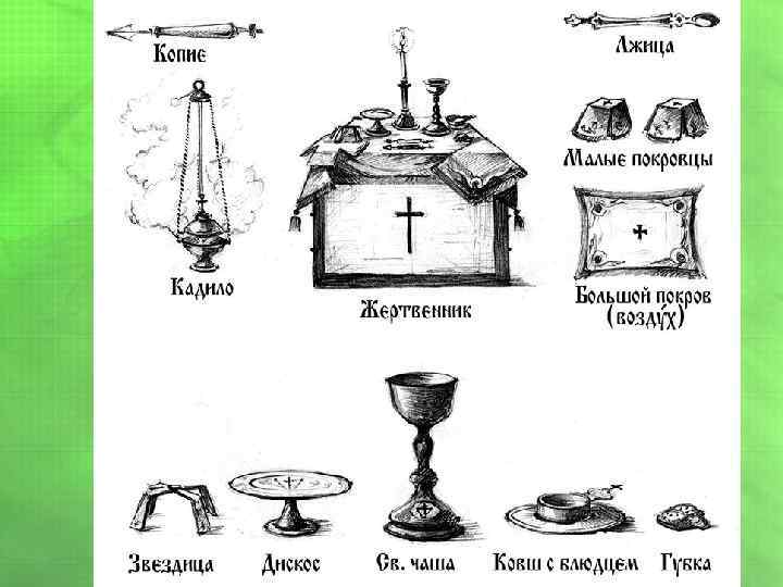 На жертвеннике находятся священные предметы: Святая Чаша или потир — сосуд, в который вливается вино с водою, прелагаемое на Литургии в Кровь Христову. Дискос — небольшое круглое блюдо на подставке. На нем полагается хлеб для преложения его на Божественной Литургии в Тело Христово. Дискос знаменует собою одновременно и ясли, и гроб Спасителя. Звездица состоит из двух небольших металлических дуг, соединенных посредине винтом так, чтобы их можно было или вместе сложить или раздвинуть крестообразно. Звездица знаменует собою звезду, явившуюся при рождении Спасителя. Она ставится на дискосе для того, чтобы покров не прикасался к вынутым из просфор частицам. Копие — нож, похожий на копье, для вынимания агнца и частиц из просфор. Оно знаменует то копье, которым воин пронзил ребра Христу Спасителю на Кресте. Лжица — ложечка, употребляемая для причащения верующих. Губка или плат — для вытирания сосудов. Малые покровы, которыми покрываются отдельно чаша и дискос, так и называются покровцами. Большой покров, покрывающий вместе чашу и дискос, называется воздухом. Он знаменует собою то воздушное пространство, в котором явилась звезда, приведшая волхвов к яслям Спасителя. Все покровы изображают пелены, которыми Иисус Христос был повит при рождении и Его погребальные пелены (плащаницу).