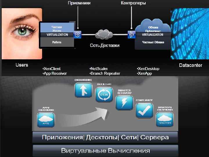 Изменения в традиционном Виртуализованные, подходе изолированные компоненты Пользователь Профиль пользователя Сборка Доставка по требованию Приложения Профиль Приложения Десктоп ОС Оборудование Десктоп ОС Приложения Профиль