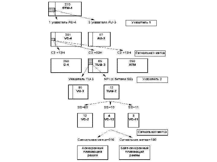 Трактовый заголовок POH-LO Сигнальная метка Бит 5 Бит 6 Бит 7 Тракт не установлен 0 0 0 Тракт установлен, но не определен 0 0 1 Асинхронный плавающий режим 0 1 0 Байт-синхронный плавающий 1 0 0 режим Тракт определен, но не 1 1 0 используется