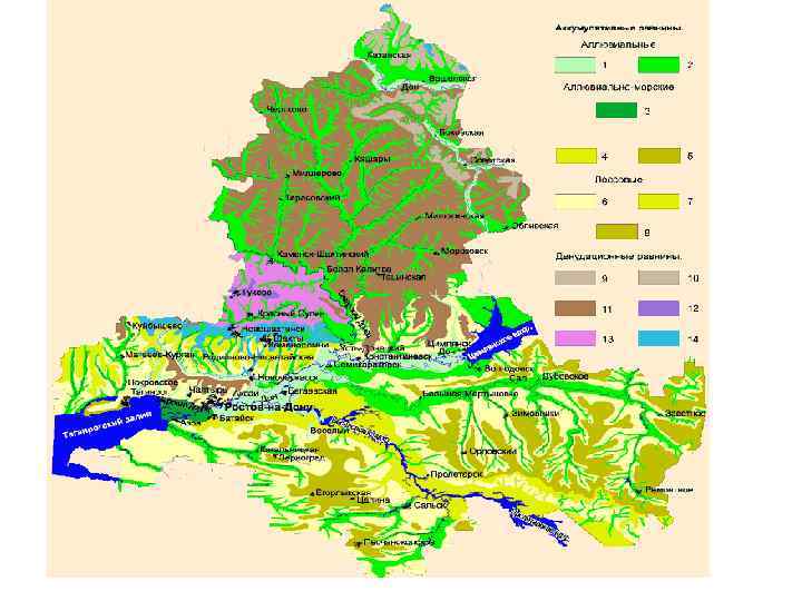 Районы четвертичных отложений Ростовской области (по их происхождению) 4. На первой надпойменной террасе Маныча и в прирусловой части Дона обнаружены морские осадки – супеси, серые и темносерые мелкозернистые пески с гравием и галькой в основании. 5. В долинах рек формируется современный пойменный аллювий, который состоит из тонко- и мелкозернистых песков и супесей с прослоями темных глин.
