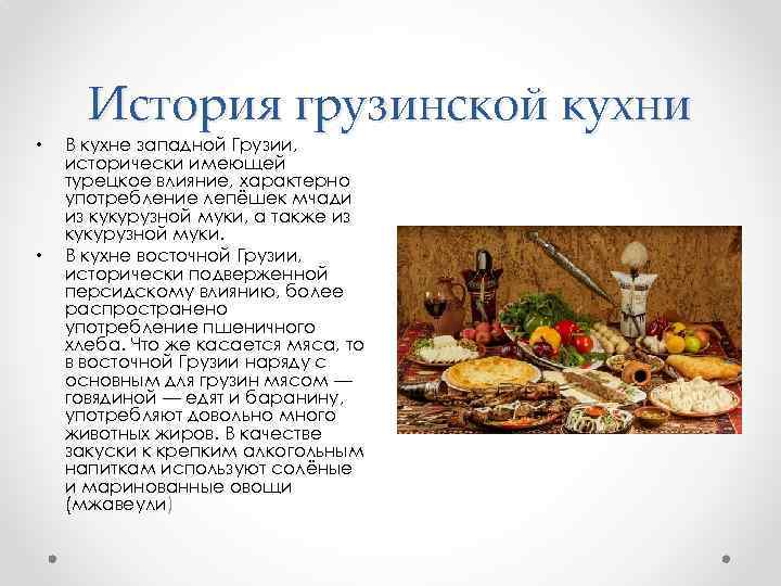 • • История грузинской кухни В кухне западной Грузии, исторически имеющей турецкое влияние, характерно употребление лепёшек мчади из кукурузной муки, а также из кукурузной муки. В кухне восточной Грузии, исторически подверженной персидскому влиянию, более распространено употребление пшеничного хлеба. Что же касается мяса, то в восточной Грузии наряду с основным для грузин мясом — говядиной — едят и баранину, употребляют довольно много животных жиров. В качестве закуски к крепким алкогольным напиткам используют солёные и маринованные овощи (мжавеули)