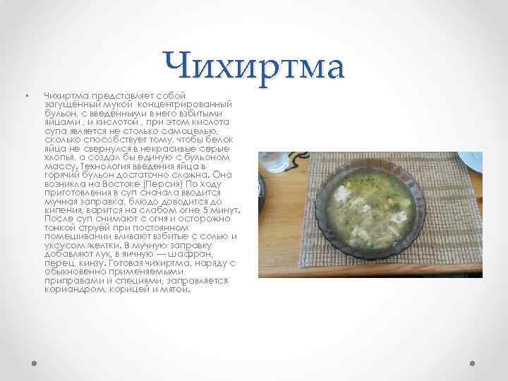 • Чихиртма представляет собой загущённый мукой концентрированный бульон, с введёнными в него взбитыми яйцами , и кислотой , при этом кислота супа является не столько самоцелью, сколько способствует тому, чтобы белок яйца не свернулся в некрасивые серые хлопья, а создал бы единую с бульоном массу. Технология введения яйца в горячий бульон достаточно сложна. Она возникла на Востоке (Персия) По ходу приготовления в суп сначала вводится мучная заправка, блюдо доводится до кипения, варится на слабом огне 5 минут. После суп снимают с огня и осторожно тонкой струёй при постоянном помешивании вливают взбитые с солью и уксусом желтки. В мучную заправку добавляют лук, в яичную — шафран, перец, кинзу. Готовая чихиртма, наряду с обыкновенно применяемыми приправами и специями, заправляется кориандром, корицей и мятой.