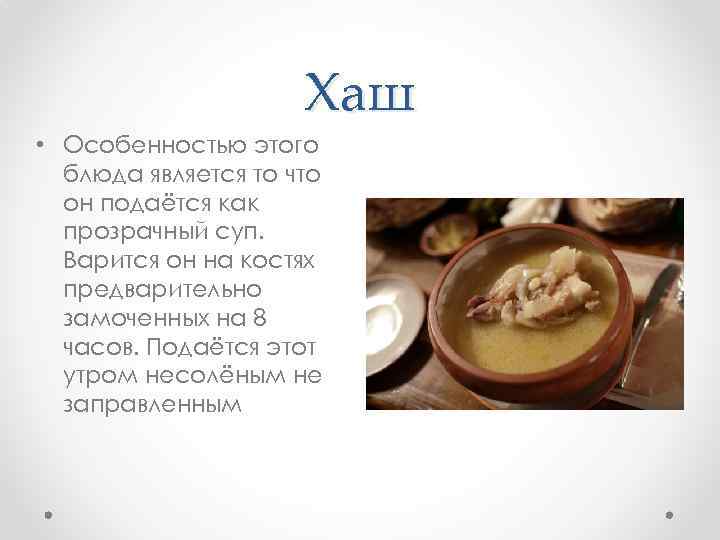 Хаш • Особенностью этого блюда является то что он подаётся как прозрачный суп. Варится он на костях предварительно замоченных на 8 часов. Подаётся этот утром несолёным не заправленным