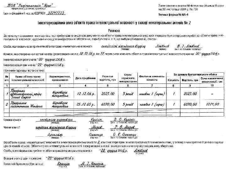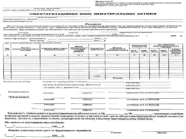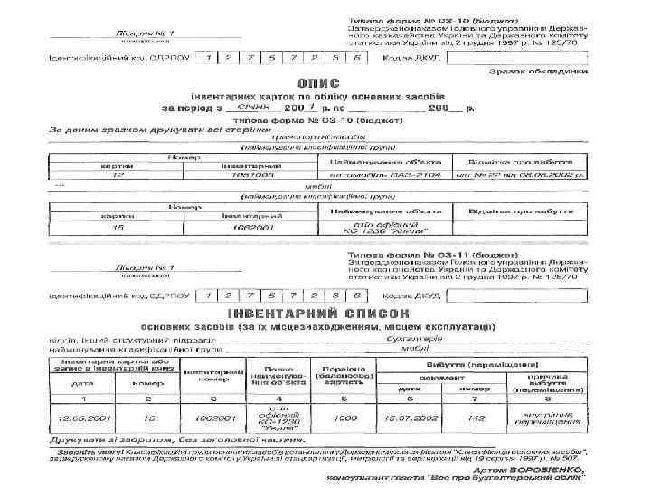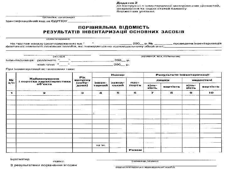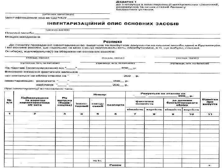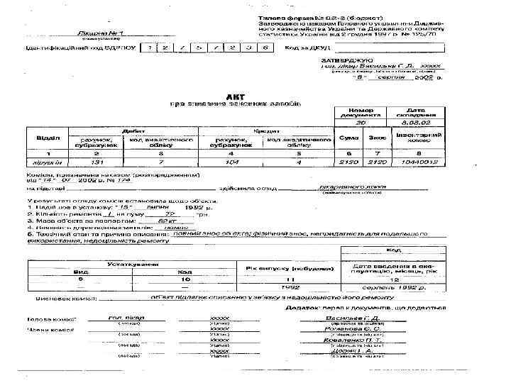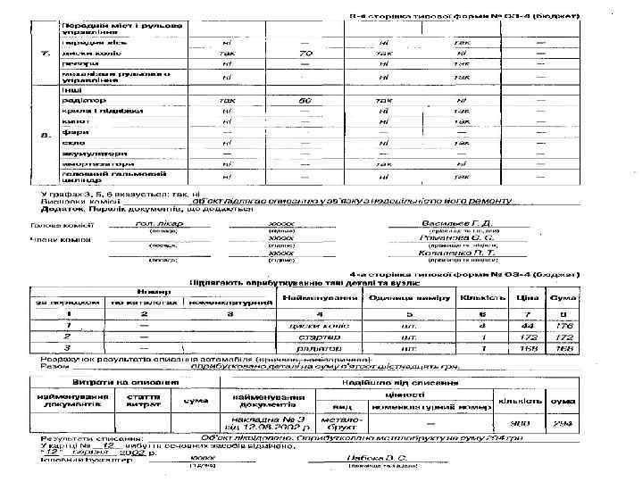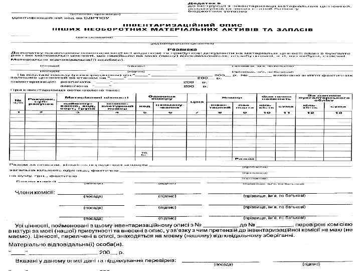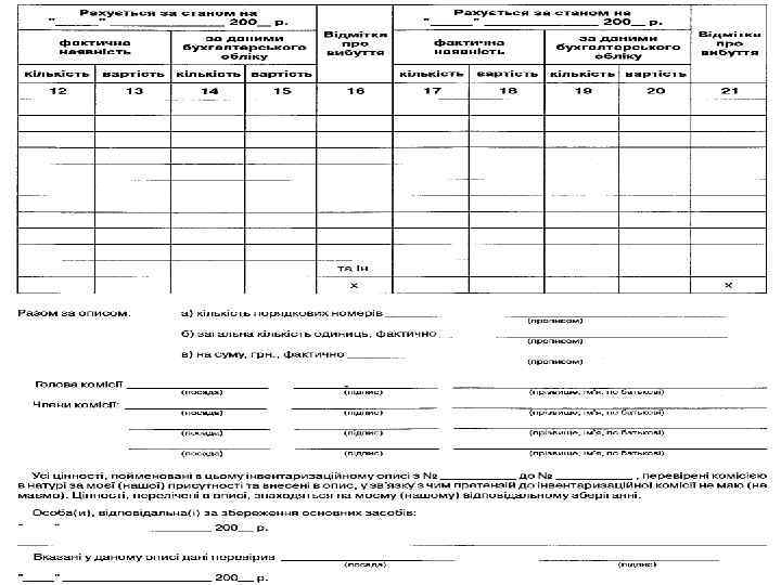Склад постійно діючої комісії для визначення непридатності і списання основних засобів • Керівник або його заступник (голова комісії); • Головний бухгалтер або його заступник; • Керівник групи обліку або інший працівник бухгалтерії, що веде облік основних засобів; • Особа, на яку покладено відповідальність за збереження і використання об′єкта основних засобів; • Інші посадові особи (спеціалісти, інженери і т. ін. – на розсуд керівника)