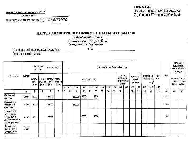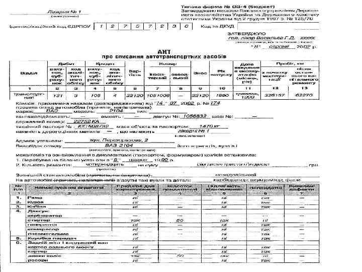 Порядок списання основних засобів бюджетних установ Джерела фінансування бюджетної установи Вартість одиниці основних засобів, грн. Кошти державного < 5000 бюджету 5000 – 10000 Дозвіл на списання дає Керівник установи Керівник вищої установи за підпорядкуванням > 10000 Кошти місцевого бюджету Міністр або керівник іншого центрального органу влади < 2500 Керівник установи 2500 – 5000 Керівник вищої установи за підпорядкуванням > 5000 Керівник місцевого органу державної адміністрації