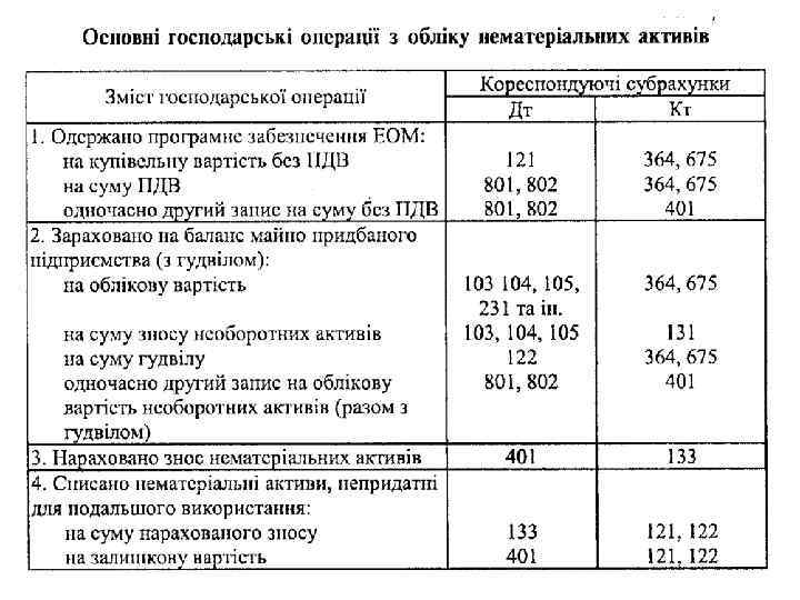 Види нематеріальних активів • Авторські та суміжні з ними права (на літературні і музичні твори, програми для ЕОМ, бази даних тощо); • Права користування природними ресурсами; • Права користування майном; • Права на знаки для товарів і послуг (товарні знаки, торгові марки, фірмові назви тощо); • Права на об′єкти промислової власності (патенти на винаходи, промислові зразки, ноу-хау тощо); • Гудвіл; • Інші нематеріальні активи