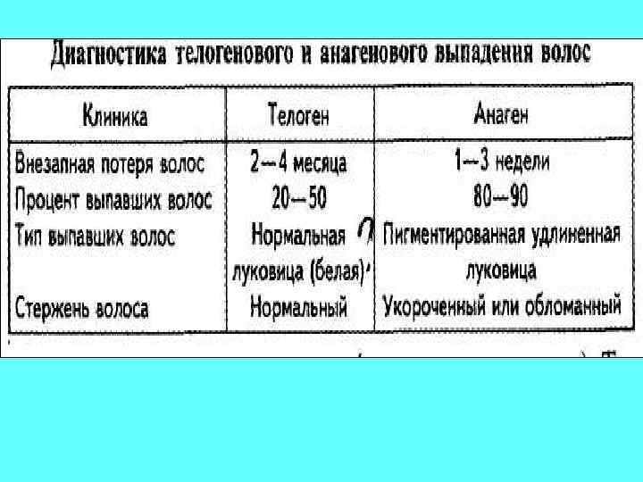 А. Причины анагенового выпадения волос 1. Цитостатики (химиотерапия онкологических больных- винбластин, винкрестин, фторурацил и т. д. ) 2. Радиация 3. Отравление таллием, ртутью, свинцом, мышьяком Лечение основного заболевания. Кортикостероиды не применяются !