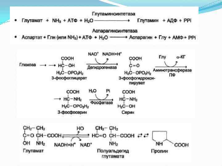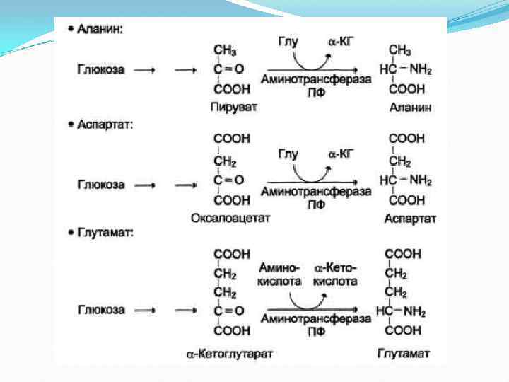 Безазотистые остатки аминокислот используются для восполнения того количества метаболитов общего пути катаболизма, которое затрачивается на синтез биологически активных веществ. Такие реакции называют анаплеротическими. Выделены пять анаплеротических реакций: 1 2. Аминокислоты → Глутамат → α-Кетоглутарат 3 4. Аминокислоты → Фумарат 5. Аминокислоты → Оксалоацетат