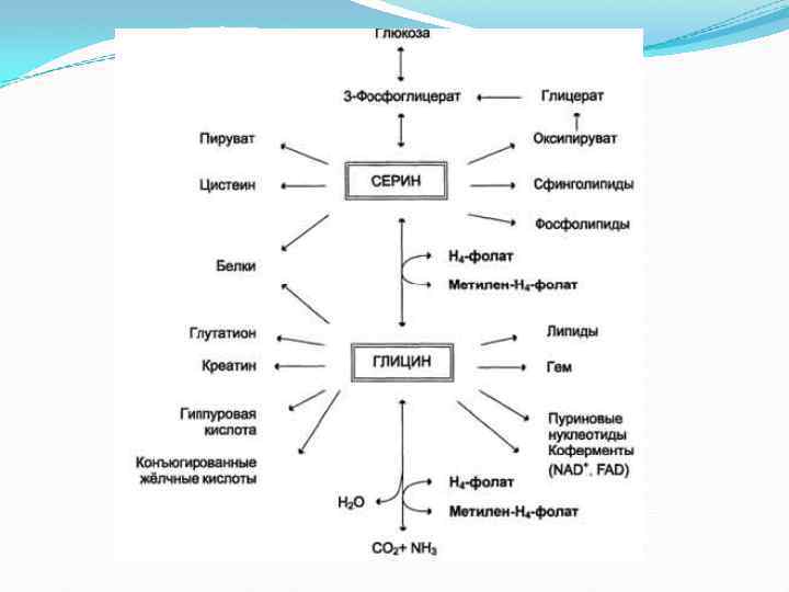 Обмен серина и глицина Серин - заменимая аминокислота, синтезируется из промежуточного продукта гликолиза - 3 -фосфоглицерата, а аминогруппу получает от глутаминовой кислоты. Глицин - также заменимая аминокислота, основным источником которой служит серии. Реакцию синтеза глицина из серина катализирует фермент сериноксиметилтрансфераза, коферментом которой является Н 4 -фолат.