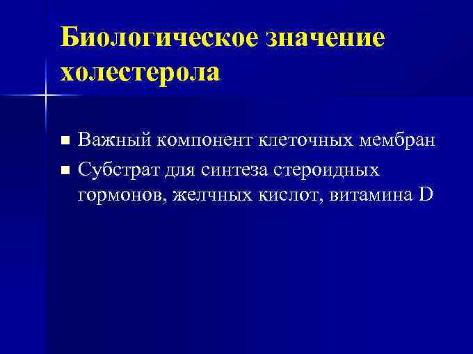 Биологическое значение холестерола Важный компонент клеточных мембран n Субстрат для синтеза стероидных гормонов, желчных кислот, витамина D n