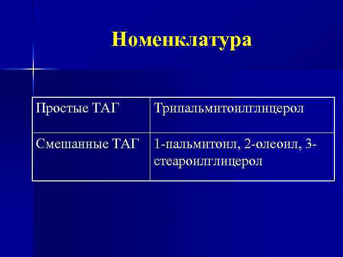 Номенклатура Простые ТАГ Трипальмитоилглицерол Смешанные ТАГ 1 -пальмитоил, 2 -олеоил, 3 стеароилглицерол