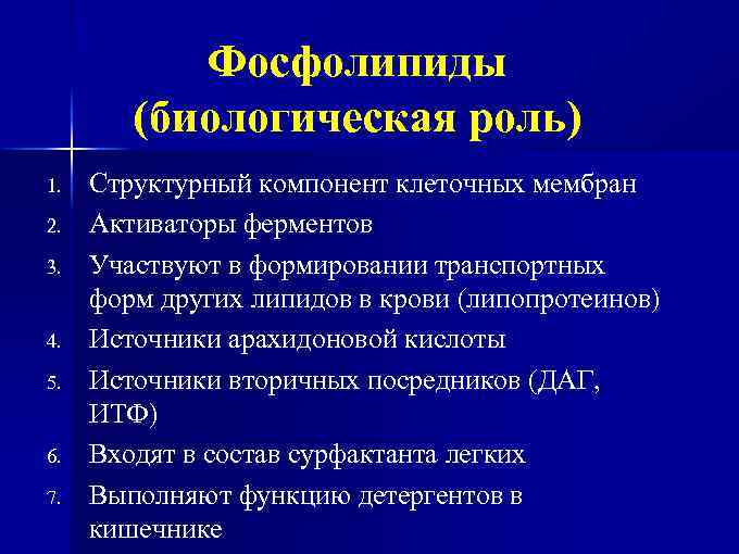 Фосфолипиды (биологическая роль) 1. 2. 3. 4. 5. 6. 7. Структурный компонент клеточных мембран Активаторы ферментов Участвуют в формировании транспортных форм других липидов в крови (липопротеинов) Источники арахидоновой кислоты Источники вторичных посредников (ДАГ, ИТФ) Входят в состав сурфактанта легких Выполняют функцию детергентов в кишечнике