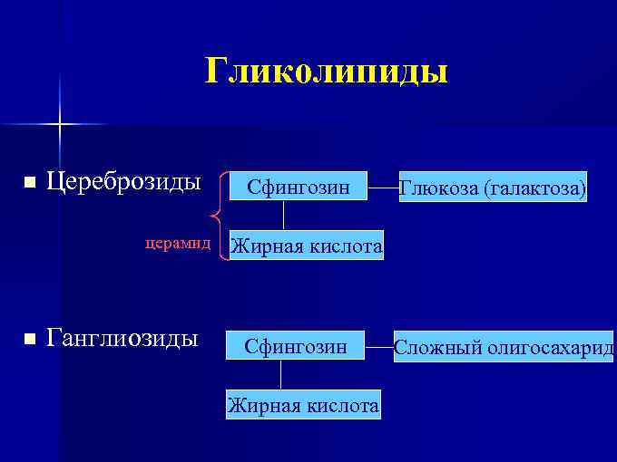 Гликолипиды n Цереброзиды церамид n Ганглиозиды Сфингозин Глюкоза (галактоза) Жирная кислота Сфингозин Жирная кислота Сложный олигосахарид