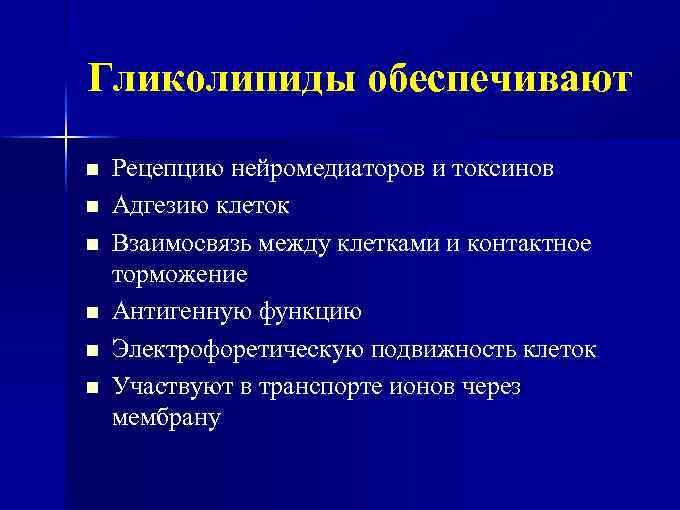 Гликолипиды обеспечивают n n n Рецепцию нейромедиаторов и токсинов Адгезию клеток Взаимосвязь между клетками и контактное торможение Антигенную функцию Электрофоретическую подвижность клеток Участвуют в транспорте ионов через мембрану