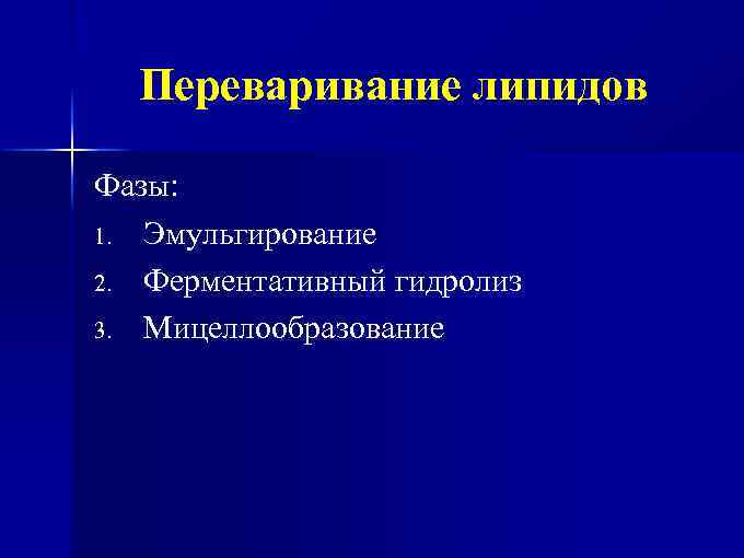 Переваривание липидов Фазы: 1. Эмульгирование 2. Ферментативный гидролиз 3. Мицеллообразование