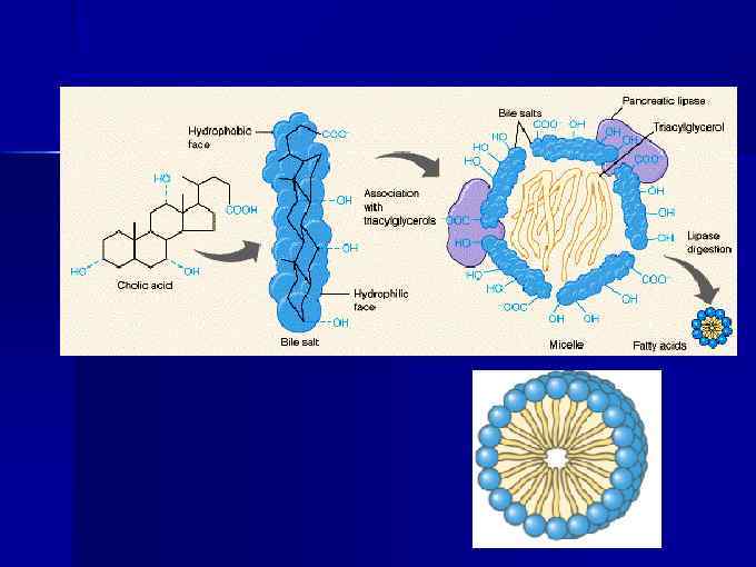 Функции желчных кислот § § Эмульгирование жиров пищи, стабилизация жировой эмульсии Образование мицелл и облегчение всасывания липидов (в т. ч. жирорастворимых витаминов) Предотвращают осаждение холестерола в желчи и образование камней Путь выведения холестерола из организма (!)
