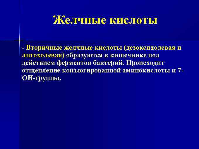 Желчные кислоты - Вторичные желчные кислоты (дезоксихолевая и литохолевая) образуются в кишечнике под действием ферментов бактерий. Происходит отщепление конъюгированной аминокислоты и 7 ОН-группы.