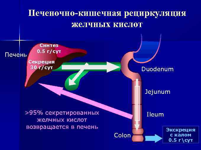 Печеночно-кишечная рециркуляция желчных кислот Печень Синтез 0. 5 г/сут Секреция 30 г/сут Duodenum Jejunum >95% секретированных желчных кислот возвращается в печень Ileum Colon Экскреция с калом 0. 5 гсут