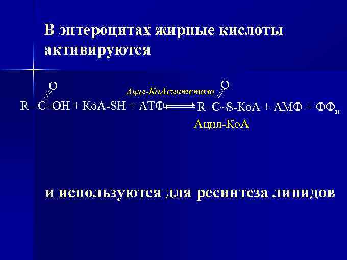 В энтероцитах жирные кислоты активируются О Ацил-Ко. Асинтетаза R– C–OH + Ко. А-SH + АТФ О R–C~S-Ко. А + АМФ + ФФн Ацил-Ко. А и используются для ресинтеза липидов