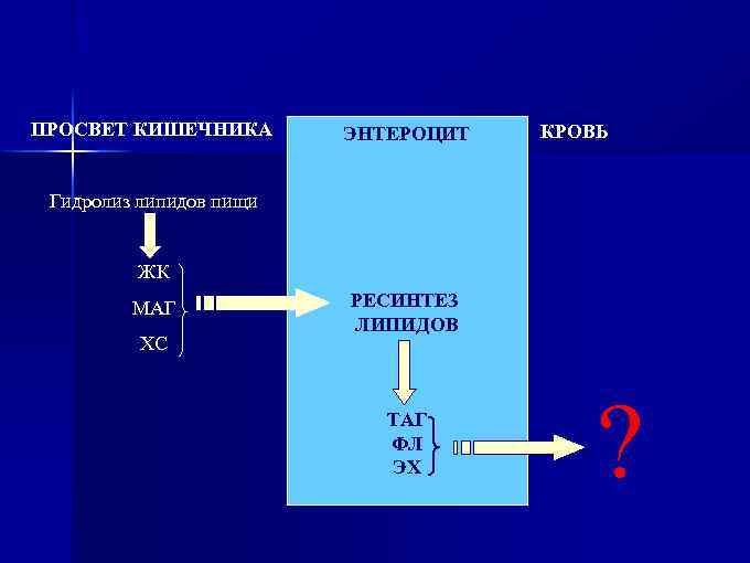 ПРОСВЕТ КИШЕЧНИКА ЭНТЕРОЦИТ КРОВЬ Гидролиз липидов пищи ЖК МАГ ХС РЕСИНТЕЗ ЛИПИДОВ ТАГ ФЛ ЭХ ?