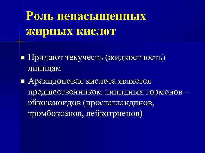 Роль ненасыщенных жирных кислот Придают текучесть (жидкостность) липидам n Арахидоновая кислота является предшественником липидных гормонов – эйкозаноидов (простагландинов, тромбоксанов, лейкотриенов) n