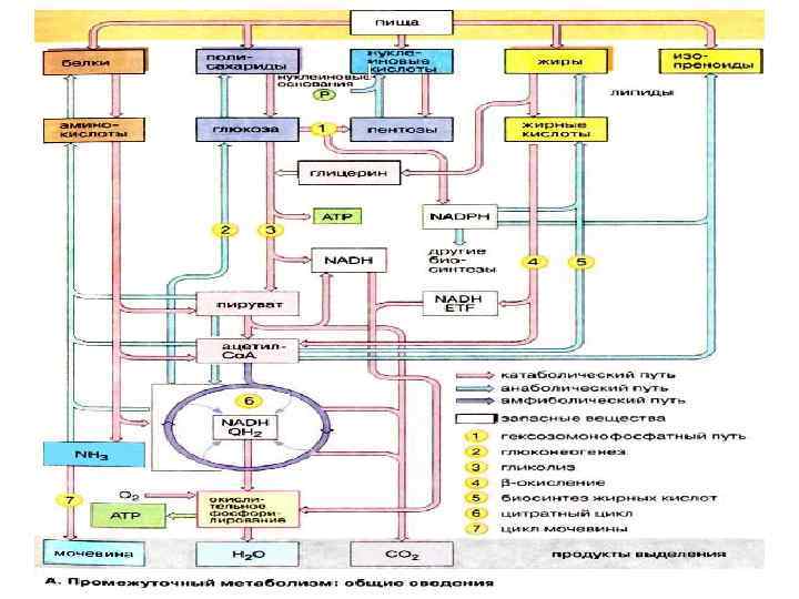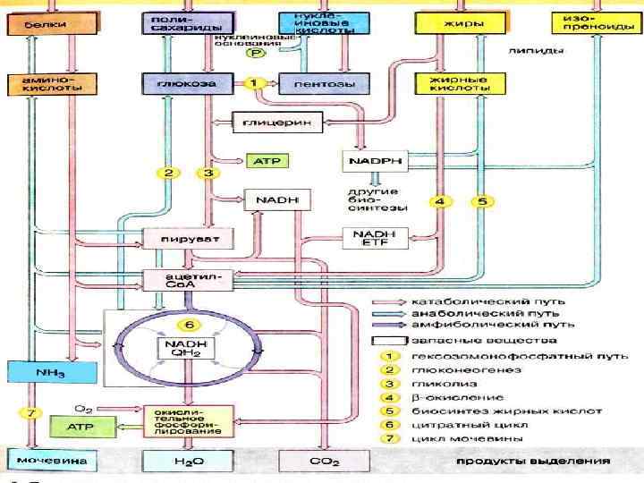 Общая схема метаболизма глюкозы: 1 - запасание углеводов в виде гликогена; 2 - мобилизация гликогена; 3 - 6 - анаболические превращения глюкозы; 7 - катаболизм глюкозы.