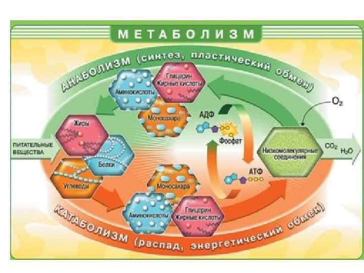 • Анаболизм – это совокупность процессов синтеза высокомолекулярных соединений (структур организма) из низкомолекулярных с затратой энергии • Катаболизм – совокупность процессов расщепления сложных молекул (пищевых веществ) до конечных продуктов (воды, СО 2, аммиака), протекающих с выделением энергии.