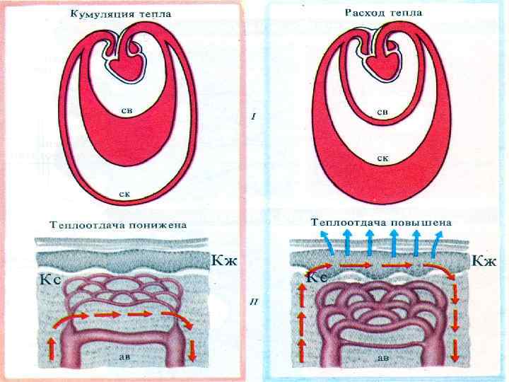 При низкой температуре среды: Вазоконстрикция сосудов кожи Увеличение теплопродукции Уменьшение теплоотдачи При высокой температуре – обратные реакции