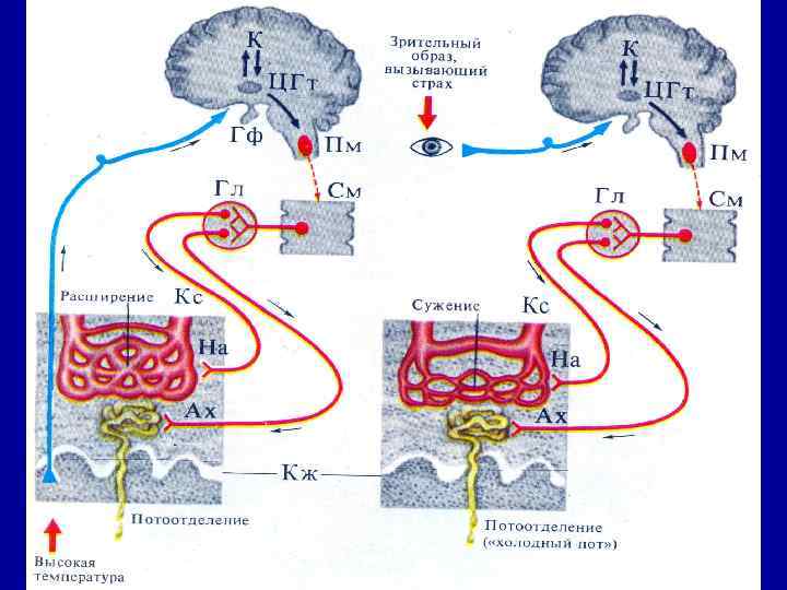 Терморегуляция обеспечивается следующими элементами: 1. Рецепторы кожи – тепловые, холодовые 2. Центр терморегуляции в гипоталамусе Задний гипоталамус – центр теплопродукции Передний – центр теплоотдачи 3. Сосуды кожи, изменение теплопродукции