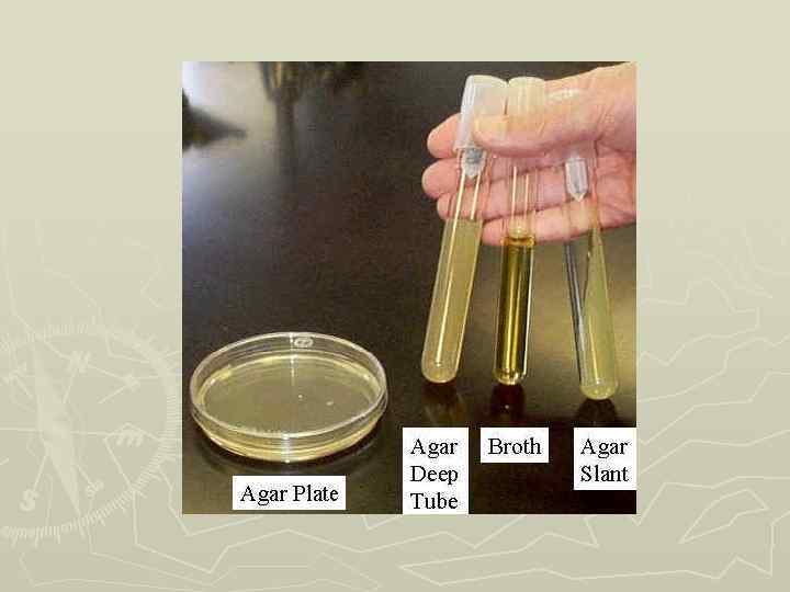 Классификация искусственных питательных сред ► По консистенции ► Жидкие – мясной или рыбный бульон на дистиллированной воде (Питательный бульон), ► Плотные – готовятся на основе жидких, добавляют 1, 5% агар-агара (полисахарид, получ-й из морских водорослей), силикагеля или 10 -15% желатины (Питательный агар) ► Полужидкие – готовят на основе жидких, но агара или силикагеля добавляют 0, 7%, а желатины – 57, 5%