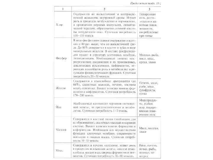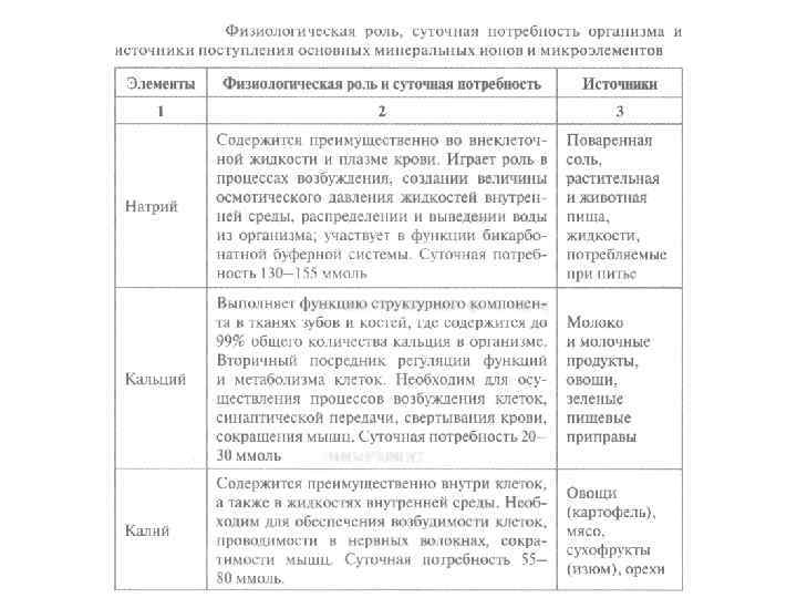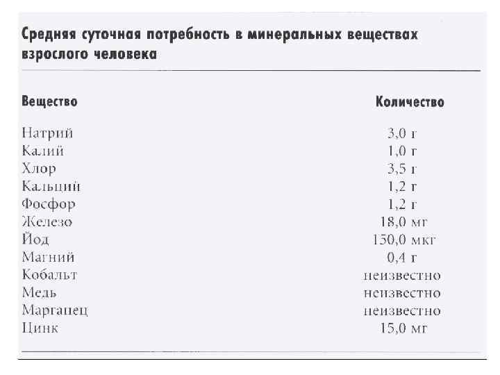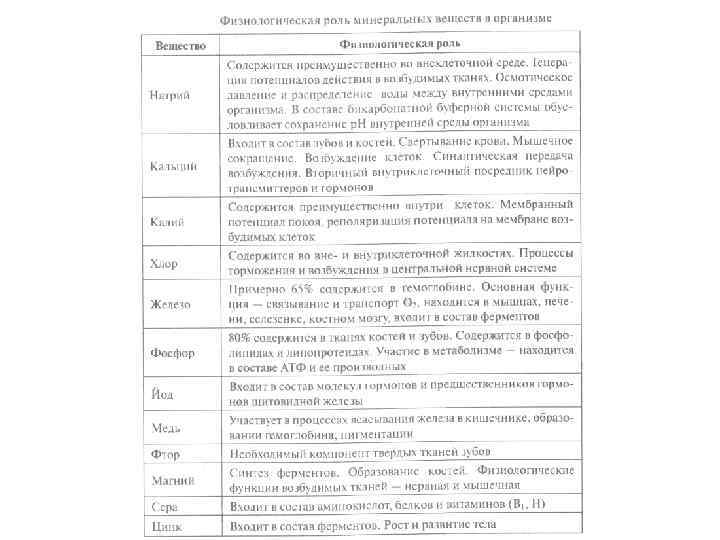 Минеральные вещества Макроэлементы кальций, калий, магний, натрий, фосфор, хлор, сера. (содержатся в количествах измеряемых сотнями и десятками миллиграммов на 100 г тканей или пищевого продукта) Микроэлементы железо, кобальт, цинк, фтор, йод, и другие (десятые, тысячные и т. д. на 100 г тканей или пищевого продукта) Значение минеральных веществ: 1. Участие в структуре и функции большинства ферментных систем и процессов, протекающих в организме; 2. Участие в пластических процессах и построении тканей организма, особенно костной; 3. Поддержание КЩ Р. 4. Поддержание нормального солевого состава крови и участия в структуре форменных ее элементов; 5. Нормализации водно-солевого обмена.
