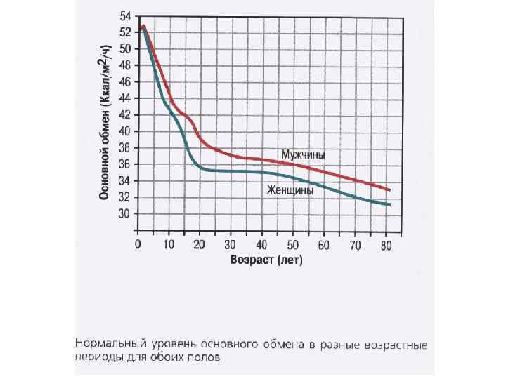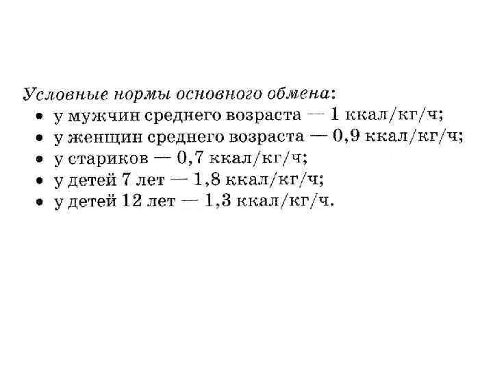 ОСНОВНОЙ ОБМЕН минимальный уровень энергозатрат, необходимый для поддержания жизнедеятельности организма в условиях относительно полного физического и эмоционального покоя Определение основного обмена проводят в стандартных условиях: 1. В утренние часы; 2. В положении лежа; 3. При максимальном расслаблении мышц, в состоянии бодрствования; 4. В условиях температурного комфорта (около 22 С 0); 5. Натощак - через 12 -14 часов последнего приема пищи. Средняя величина основного обмена (для взрослого) – 1 ккал/кг/час. Для мужчин (m=7 О кг) - около 1700 ккал/сут (или 7100 к. Дж/сут или 84 Вт); для женщин - около 1500 ккал/сут.
