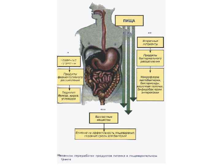 Теория адекватного питания (ТАП) 1. Питание поддерживает молекулярный состав и возмещает энергетические и пластические расходы организма на основной обмен, внешнюю работу и рост (общий постулат для той и другой теории); 2. Нормальное питание обусловлено не одним потоком нутриентов из ЖКТ во внутреннюю среду организма, а несколькими потоками нутриентов и регулируемых веществ, имеющими важное значение: 1 -й поток веществ - гормоны и БАВ; 2 -й – поток бактериальные метаболиты; 3 -й – поток состоит из веществ, поступающих с загрязненной пищей или загрязненной внешней среды; 3. Балластные вещества являются необходимыми компонентами пищи; 4. В метаболическом и особенно трофическом отношении ассимилирующий организм является надорганизменной системой; 5. Существует эндоэкология организма хозяина, образуемая микрофлорой кишечника, с которой организм хозяина поддерживает сложные симбионтные отношения, а также кишечной, или энтеральной средой; 6. Баланс пищевых веществ в организме достигается в результате освобождения нутриентов из структур пищи при ферментативном расщеплении ее макромолекул за счет полостного и мембранного пищеварения, а в ряде случаев - внутриклеточного (первичные нутриенты), а также вследствие синтеза новых веществ, в том числе незаменимых, бактериальной флорой кишечника (вторичные нутриенты).