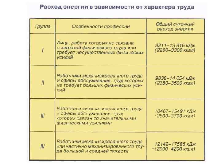 4 группа работники тяжелого физического труда, коэффициент физической активности - 2, 2; Энерготраты - 3400 -37000 ккал/сут; (строительные рабочие, помощники буровиков, хлобкоробы, основная масса сельскохозяйственных рабочих, доярки, овощеводы, деревообработчики, металлурги, литейщики); 5 группа работники особо тяжелого физического труда, коэффициент физической активности - 2, 5; (только для мужчин); Энерготраты – 3900 -4500 ккал/сут) (механизаторы и сельскохозяйственные рабочие в посевной и уборочный период, горнорабочие, вальщики леса, бетонщики, каменщики, землекопы, оленеводы, грузчики).