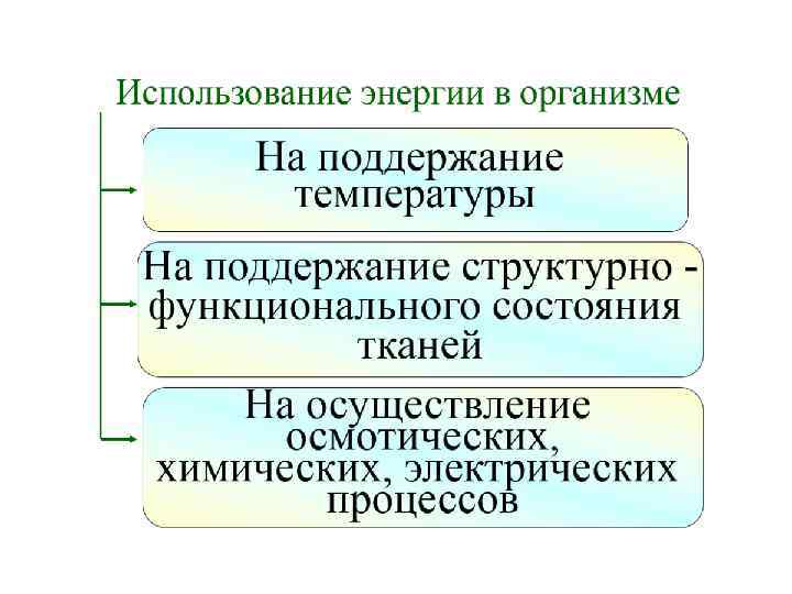 Обмен энергии • • • В основе процессов обмена энергии лежат законы термодинамики Принцип устойчивого неравновесия живых систем (Э. С. Бауер): живые системы никогда не бывают в равновесии с окружающей средой и исполняют за счет своей внутренней энергии постоянную работу против равновесия, требуемого законами физики и химии: Первый закон термодинамики М. В. Ломоносов, А. Лавуазье: энергия не исчезает и не образуется вновь, переходит из одной формы в другую- механическая, кинетическая энергия и теплота превращаются друг в друга. Второй закон (Л. Больцман): часть энергии способна к превращениям и совершению полезной работы, другая часть рассеивается в виде тепла, характеризуя меру термодинамической системы –энтропию. Свободная энергия поступает в организм с питательными энергетическими веществами, а также с солнечной энергией. Энергия транспортируется в химическую, электрическую, механическую и осмотическую энергии. Энергозатраты зависят от пола, возраста, массы, интенсивности работы, суток, времени года, температура окруж. среды, влажности, барометрического давления и др. Энергия затрачивается на клеточный метаболизм, мышечную деятельность, секреторную, нервное возбуждение.