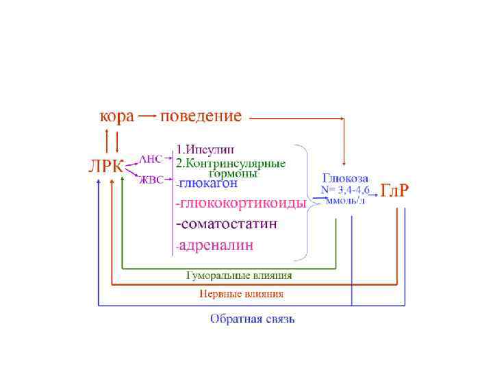 Функции углеводов • Углеводы –энергетический субстрат; • Пластическая функция (синтез гликопротетнов, гликолипидов, промежуточные продукты окисления пентозы). • Глюкоза участвует в поддержание осмотического давления крови. • Пути поступления глюкозы (из ЖКТ, распад гликогена, в результате глюконеогенеза). • Пути расходования глюкозы: тканевой метаболизм, депонирование ввиде гликогена, превращение в липиды, удаление с мочой (глюкозурия). • Центром регуляции является гипаталамо-гипофизарная система, которая реализует свои эфферентные влияния через симпатические и парасимпатический отделы ВНС и эндокринную систему (↑глюкозу адреналин, глюкокортикоиды, глюкогон, АКТГ, СТГ). Инсулин ↓.