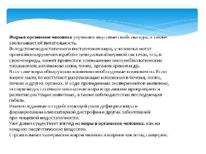 • • Последствия избыточного поступления жиров с пищей сопровождается повышением общей концентрации триглицеридов и жирных кислот в крови, увеличением количества циркулирующих в крови липопротеинов. Все это ведет к гиперлипидемии, а в дальнейшем к развитию дислипопротеинемии (наблюдается повышение в крови ЛПНП, ЛПОНП, триглицеридов и снижение количества ЛПВП, которые снижают атерогенность ХН) лежащей в основе развития атеросклероза, сахарного диабета и избыточной массы тела и ожирения. При поступлении жира в избыточном количестве по сравнению с потребностью организма также стимулируется глюконеогенез. Последнее обстоятельство приводит к снижению степени утилизации «углеводной» глюкозы из крови, увеличению нагрузки на инсулярный аппарат и проявляется у здорового человека в росте концентрации гликозилированного гемоглобина А. В природе не существует «идеального с позиций оптимального питания источника жира. Жирно-кислотный состав всех используемых растительных масел наряду со значительным содержанием МНЖК и ПНЖК включает в себя и существенные количества среднецепочечных НЖК (10 -15% и более). Большинство липидных соединений организма человека могут при необходимости быть синтезированы в обменных процессах из углеводов. Исключение составляют незаменимые ПНЖК линолевая и линоленовая. В этой связи нормируется как общее поступление ПНЖК: оно должно быть в интервале 3 -7 % энергоценности рациона, так и потребность в линолевой кислоте: 6 -10 г/сут (это количество содержится в 1 столовой ложке растительного масла). Норматив для линоленовой кислоты не установлен, но ее должно поступать не меньше 10% от содержания в пище линолевой кислоты.