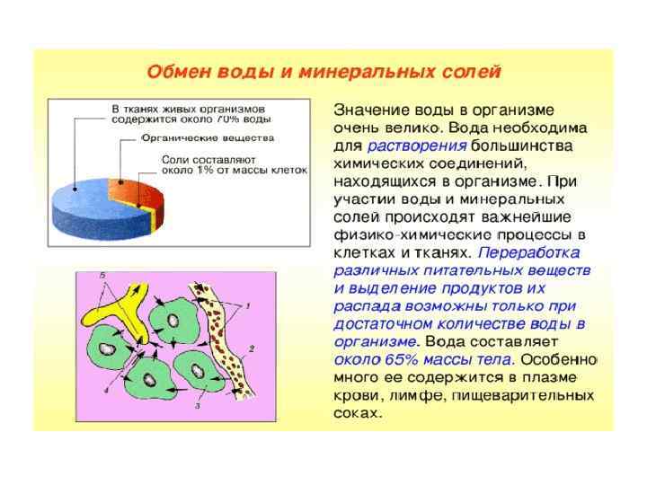 • • • • Роль воды в организме. Вода конституционная – компонент клеток и тканей. Наилучший растворитель для многих биологически важных веществ, во многих случаях основной участник биохимических реакций (свободная вода) Способствует гидратации макромолекул, участвует в их активации (связанная вода) Растворяя конечные продукты обмена веществ, способствует их экскреции почками и другими органами Обладая высокой теплотой испарения, обеспечивает приспособление организма к высокой температуре окружающей среды. Недостаточное содержание в организме воды (дегидратация) может приводить к сгущению крови, нарушению кровотока. При снижении количества воды на 20 % наступает смерть. Избыток воды может приводить к водной интоксикации, проявляющейся в набухании клеток, снижении осмотического давления. Взрослый человек употребляет в среднем 2, 5 л, дополнительно используется 300 мл метаболической воды. Регуляция водно – солевого обмена. Существуют две функционально связанные системы, регулирующие водно-солевой гомеостаз, - антидиуретическая и антинатрийуретическая. Первая направлена на сохранение в организме воды, вторая обеспечивает постоянство содержания натрия. Эфферентным звеном каждой из этих систем являются главным образом почки, афферентная же часть включает в себе осморецепторы и волюморецепторы сосудистой системы, воспринимающие объём циркулирующей жидкости. При повышении осмотического давления крови (из-за потери воды или избыточного поступления соли) происходит возбуждение осморецепторов, повышается выход антидиуретического гормона, усиливается реабсорбция воды почечными канальцами и снижается диурез. Одновременно возбуждаются нервные механизмы, обуславливающие возникновения жажды. При избыточном поступлении в организм воды образование и выделение антидиуретического гормона резко снижается, что приводит к уменьшению обратного всасывания воды в почках. Регуляция выделения и реабсорбции воды и натрия в значительной мере зависит так же от общего объёма циркулирующей крови и степени возбуждения волюморецепторов, существование которых доказано для левого и правого предсердия, для устья лёгочных вен и некоторых артериальных стволов. Импульсы от волюморецепторов поступают в головной мозг, который вызывает соответственное поведение человека - он начинает или больше пить воды или наоборот организм больше выделяет воды через почки, кожу и другие выделительные системы. Важнейшее значение в регуляции водно-солевого обмена имеют внепочечные механизмы, включающее в себя органы пищеварения и дыхания, печень, селезёнку, а также различные отделы центральной нервной системы и эндокринные железы.