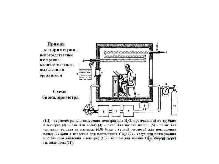 • • • Физическая калориметрия- метод определения ценности питательных веществ, калорическую ценность определяют путем сжигания 1 г в калориметре при пропускании электрического тока. Химическая калориметрия –основана на окислении пищевых веществ окислителями с известным количеством кислорода. Физиологическая калориметрия- для определения энергозатрат организма. Количество тепла выделяемого организмом рассчитывается методом прямой калориметрией (определение тепла с помощью биокалориметров). Непрямая: полным газовым анализе – энергозатраты за единицу времени по количеству поглощенного испытуемым кислорода и выделенного углекислого газа. Дыхательный коэффициент – отношение объемов выделенного углекислого газа к объему поглощенного кислорода. Калорический эквивалент 1 л кислорода показывает, какое количество тепла выделяется при поглощении организмом 1 л кислорода. Неполный газовый анализ-расход энергии по количеству кислорода, потребляемого испытуемым за единицу времени с помощью спирометаболографа, поглощающего СО 2 и позволяющего определить количество поглощенного испытуемым О 2.