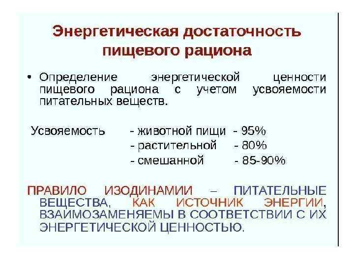 Принципы составления пищевых рационов: • Принимаемая пища должна по калорийности покрывать энергетические расходы; • Учет усвояемости пищи; • Учет норм питания; • Оптимальное соотношение белков, жиров и углеводов; • Процентное распределение питательных веществ: завтрак-30%, обед-40 -50, ужин 10 -20%. • Энергетический баланс –поступление энергии в организм равно ее расходу. • Аппарат контролирующий поступление, содержание и расходование энергетических веществ находится на уровне гипоталамуса акцептор результате действия.