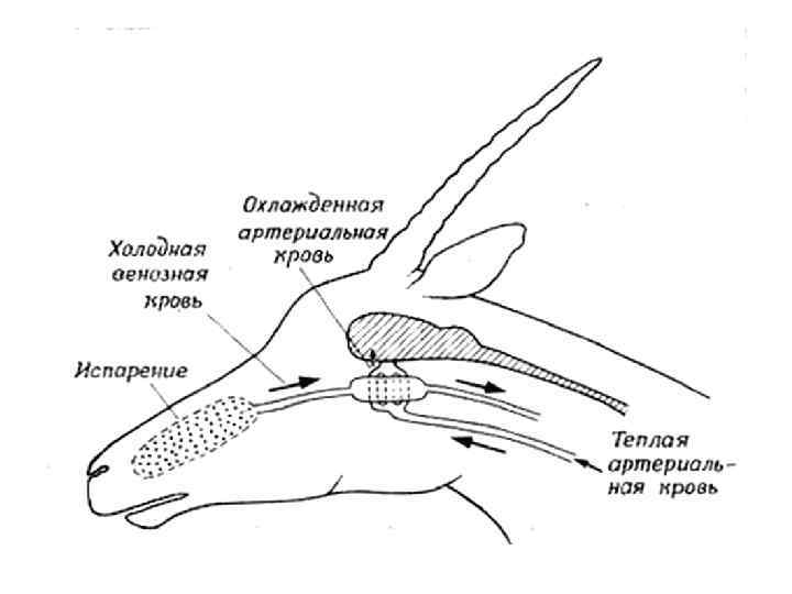 Кaротидная сеть и противоточное охлаждение крови из сонной артерии у овцы. Холодная венозная кровь, возвращаясь из носовой полости, омывает каротидную сеть, расположенную в кавернозном (пещеристом) синусе, и забирает тепло у артериальной крови, которая направляется в виллизиев круг, а затем — в головной мозг (Hayward, Balker, 1969).