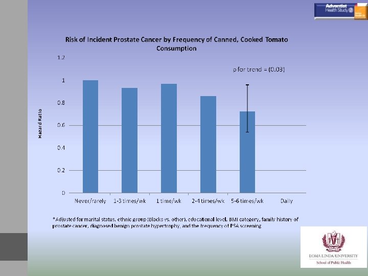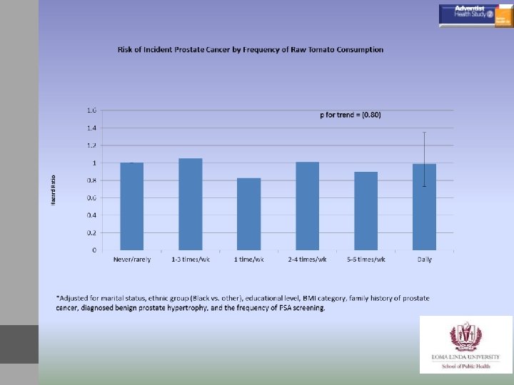 Не для публикаций или ссылок Что можно сказать о раке простаты у чернокожих мужчин? • • • 1. Уровень рака простаты среди чернокожих американских адвентистов почти вдвое выше, чем у белых (высокое статистическое значение) 2. Чернокожие потребляют больше сои, чем белые, но, с точки зрения заболеваемости раком простаты, похоже, не имеют ощутимых преимуществ. 3. В общем, чернокожие строгие вегетарианцы, похоже, имеют те же преимущества, что и белые веганы. 4. Связь меньшего числа случаев рака простаты с питанием вареными/консервированными помидорами практически одинакова для чернокожих и белых людей. 5. Чтобы сделать выводы по чернокожим людям, вероятно, нужно иметь больше данных для достижения статистического значения. 6. Необходимы новые исследования.