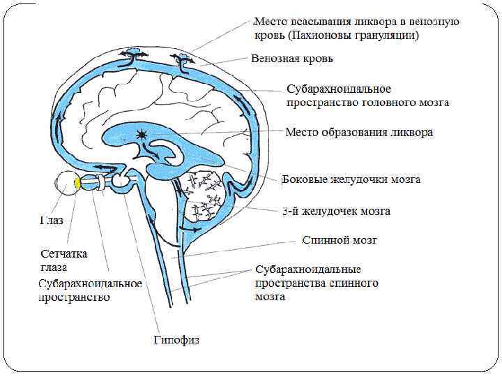 Экскурсия ликвора Боковые желудочки отверстия Монро III желудочек сильвиев водопровод IV желудочек парные отверстия Люшка и непарное Мажанди субарахноидальное пространство мозговые цистерны и конвекситальная поверхность мозга конечная цистерна
