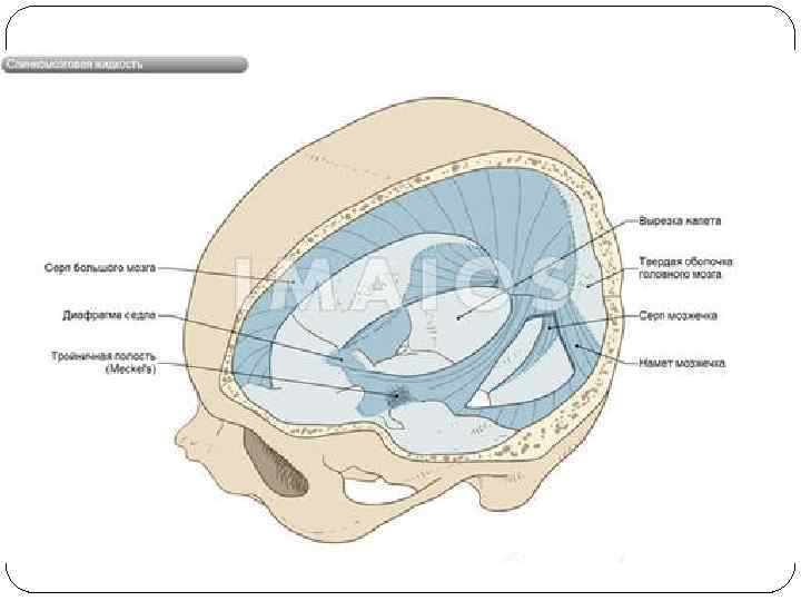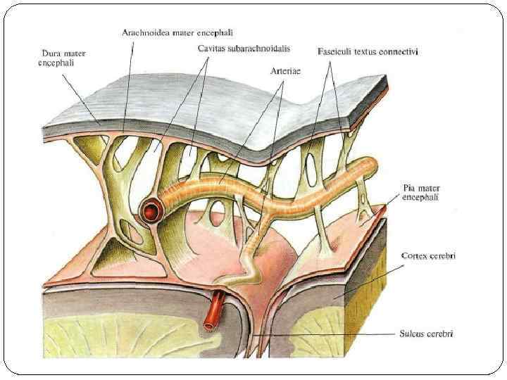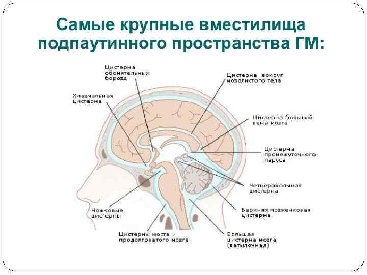Паутинная оболочка мозга связана с мягкой мозговой оболочкой посредством трабекул , вследствие чего между нею и подлежащей мягкой оболочкой образуется подпаутинное (субарахноидальное) пространство, содержащее циркулирующую в нем цереброспинальную жидкость. В отдельных участках субарахноидальное пространство расширяется, образуя подпаутинные цистерны. • Базальная под основанием мозга • Боковые цистерны – между нижней поверхностью мозжечка и продолговатым мозгом • Конечная – в позвоночном канале, где плавает конский хвост • Оптико-хиазмальная – вокруг турецкого седла