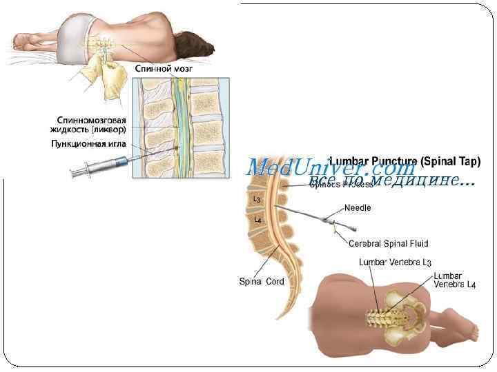 Люмбальная пункция Показания: 1. С диагностической целью: инфекционные заболевания, ОНМК и т. д. 2. С лечебной целью : введение антибиотиков , для снижения внутричерепного давления.