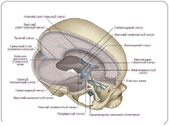 Твердая оболочка головного мозга состоит из двух листков, наружного и внутреннего, плотно прилежащих друг к другу и к внутренней поверхности костей черепа. Она образует удвоения, дупликатуры: • большой серповидный отросток – между большими полушариями • малый серповидный отросток – между полушариями мозжечка • мозжечковый намет – между затылочными долями мозга и мозжечком В местах отхождения отростков твердая оболочка расслаивается, формируя венозные синусы. В синусы оттекает кровь из вен головного мозга, твердой оболочки, костей черепа и собирается в систему внутренних яремных вен.