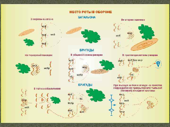 Место и роль МСР в боевом порядке МСБ в обороне Рота переходит к обороне обычно в составе батальона, иногда самостоятельно, в целях отражения контратаки превосходящих сил противника, удержания захваченного рубежа и обеспечения флангов наступающих подразделений. Она может обороняться в первом или во втором эшелоне батальона, в полосе обеспечения или на передовой позиции бригады.