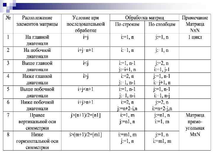 3. Если искомая величина определяется для строк или столбцов, то начальное присвоение и вывод результата осуществляется число раз, равное числу внешних циклов. Блок начального присвоения размещается на входе во внутренний цикл, а блок вывода результатов – на выходе из внутреннего цикла. 4. Если искомая величина определяется для строк, то внешний цикл организовывается по строкам, а внутренний – по столбцам. Если искомая величина определяется для столбцов, то внешний цикл организовывается по столбцам, а внутренний – по строкам. При обработке матриц часто встречаются задачи, действия в которых осуществляются с элементами, расположенными определенным образом относительно главной или побочной диагонали, вертикальной или горизонтальной оси симметрии матрицы.