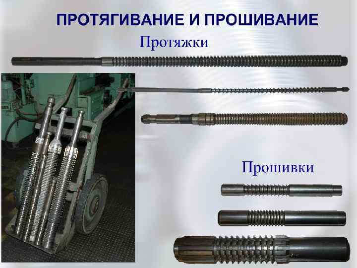 ОСНОВНЫЕ ПОНЯТИЯ И ТЕХНОЛОГИЧЕСКИЕ ВОЗМОЖНОСТИ ПРОТЯГИВАНИЯ Протягивание - технологический способ обработки заготовок с помощью многолезвийных инструментов: протяжек и прошивок. Основные преимущества: 1. 2. 3. 4. 5. Недостатки: Высокая производительность; 1. Сложность изготовления Достигается высокая точность (IT 6); инструмента; Малая шероховатость(Ra=0, 16 мкм); 2. Высокая стоимость инструмента; Возможность упрочнения 3. Горизонтальная протяженность обработанной поверхности; (станки занимают большую площадь). Использование неквалифицированного труда; Высокая производительность способа обеспечивается: • Большой длиной режущих кромок участвующих в обработке; • Совмещением резания, выглаживания и деформирования; • Отсутствием холостых ходов.
